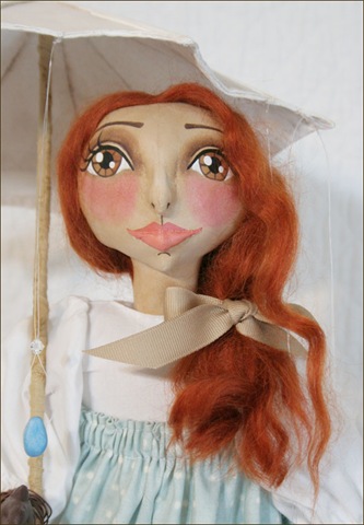 April’s wire & fabric umbrella features lots of hand-stitching as well. It’s been painted & aged. Paperclay rain drops are attached with invisible filament. A swarovski crystal accompanies each raindrop adding just the right bit of sparkle. April’s umbrella is attached to her hand with rusty wire. It is sewn to her blouse as well & is not removable.